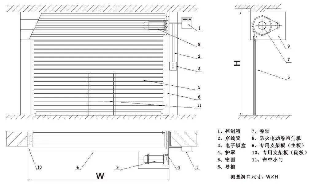 防火卷簾由簾面、導軌、座板、門楣、箱體并配以卷門機和控制箱等結構組成,