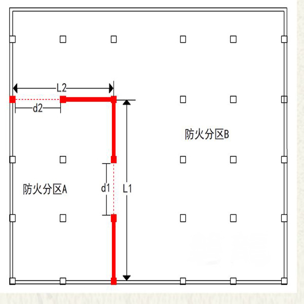 如上圖所示不管2個相鄰防火分區之間分隔的形狀如何,其分隔部分寬度均為所有距離相加,即L1和L2相加,其防火卷簾寬度也是d2和d1相加計算后滿足規范要求。